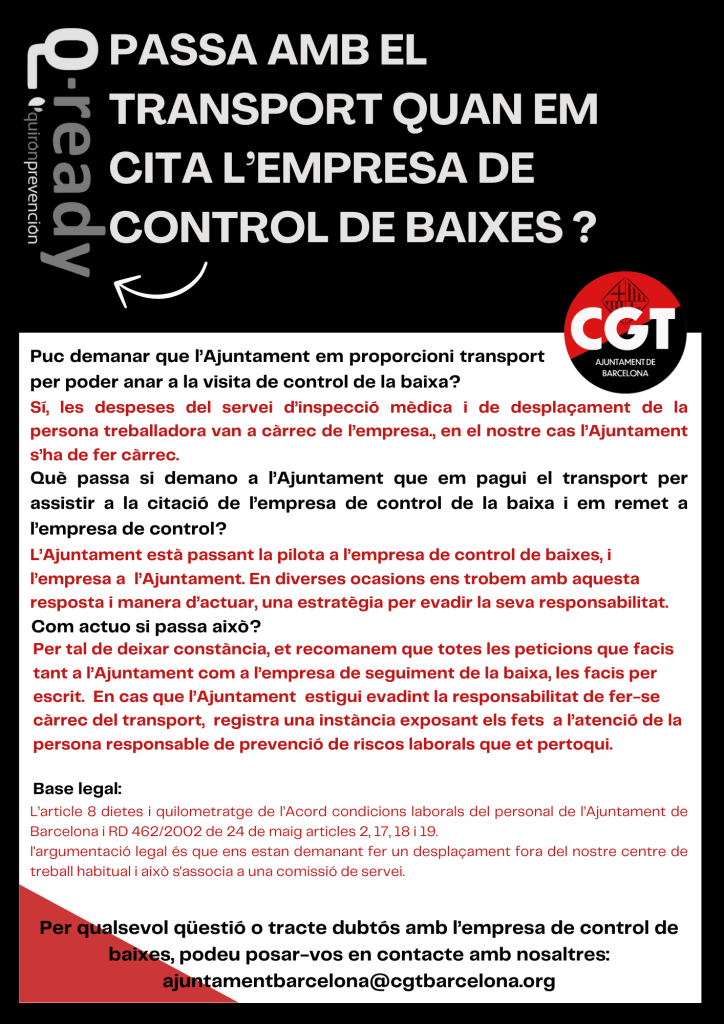 És evident que amb l’empresa Q-ready, els mecanismes de comunicació i supervisió (si n’hi ha) no estan funcionant, així com tampoc la transparència i la responsabilitat de l’Ajuntament vers la greu problemàtica que denunciem des de fa un any. És per això que també un dels objectius i propostes de conveni per part de la CGT serà modificar l’article 45 on s’estableix el servei del control de baixes per contingències comunes vinculat al 100% de cobrament de la baixa per incapacitat temporal.