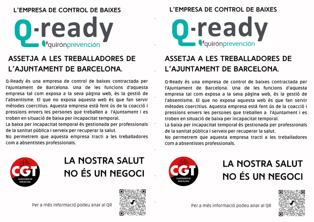 A finals del 2023 van començar a arribar a la secció sindical de CGT a l’Ajuntament de Barcelona escrits i trucades amb consultes i queixes de les treballadores vers el servei d’inspecció i seguiment de baixes per contingències comunes contractat per l’Ajuntament de Barcelona. Aquest servei és proporcionat per l’empresa Q-ready, vinculada al gegant de la sanitat privada Quirón Salut. Aquest seguiment de les baixes per contingències comunes ve emparat en l’article 45 de l’Acord de Condicions de Treball pel personal funcionari i laboral de l’Ajuntament de Barcelona. El que òbviament no ve emparat ni és admissible, són les amenaces i coaccions exercides que diverses persones han mencionat durant les visites i trucades fetes per aquesta empresa.