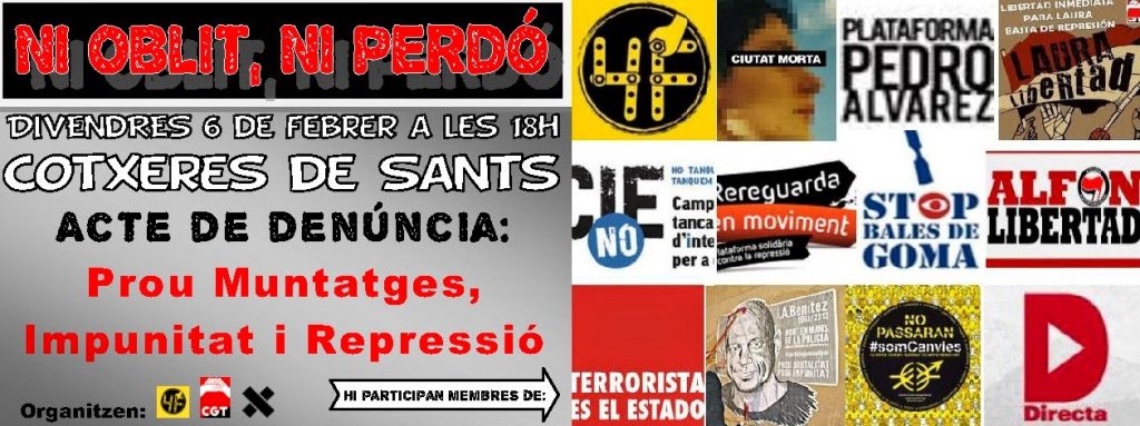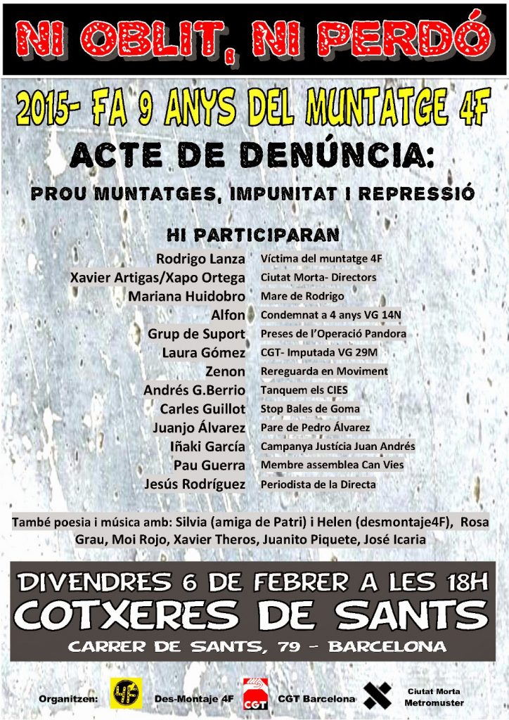 Y el viernes 6F se realizará un acto en las cocheras de Sants a las 18h, donde el caso 4F es cabeza de cartel, pero en el que también asistirán otros compas que se han visto implicados en este tipo de montajes o que luchan contra ellos.